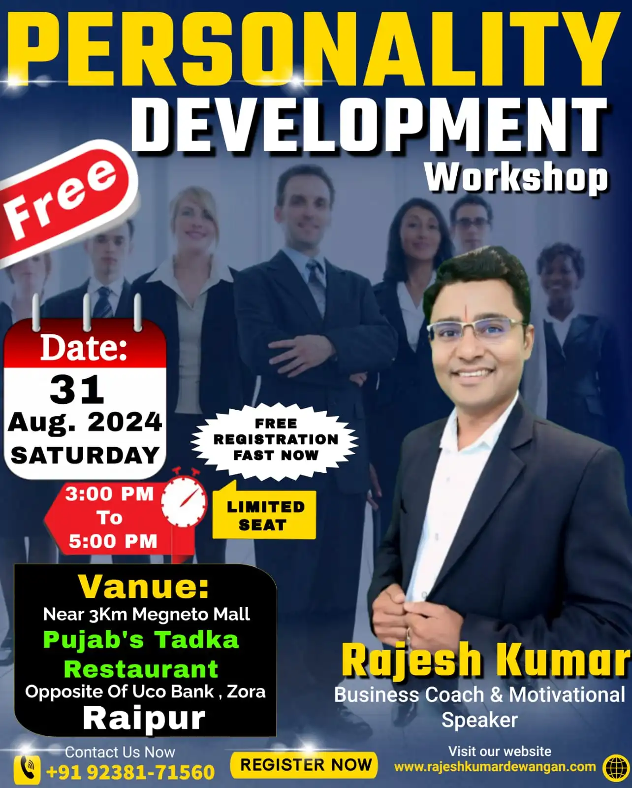 Registration is free and easy. Simply call +91 92381-71560 or visit www.rajeshkumardewangan.com to book your seat. Remember, seats are limited, so early registration is essential to secure your spot.